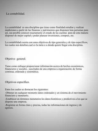 Este documento describe los conceptos básicos de la contabilidad. Explica que la contabilidad estudia las finanzas de las personas y empresas para conocer el estado de sus cuentas y poder planificar mejor. Luego detalla los objetivos generales y específicos de la contabilidad, así como los diferentes tipos como la contabilidad pública, privada, de costos, fiscal, financiera, administrativa y por actividades. Finalmente, resume el ciclo contable que comprende el registro, clasificación y resumen de la información desde que surgen las transacciones hasta la preparación