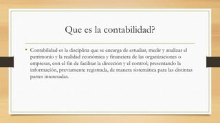 La contabilidad estudia, mide y analiza el patrimonio y la situación financiera de las organizaciones para facilitar su dirección y control. Su objetivo es conocer el estado financiero de un negocio para determinar su rentabilidad y capacidad de crecimiento. Existen diferentes tipos de contabilidad según el campo, y un ciclo contable normalmente dura un año, dividido en apertura, registro de transacciones y cierre de cuentas.