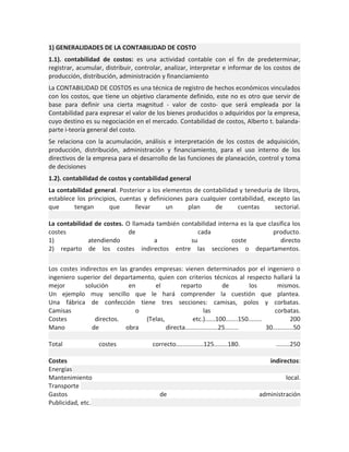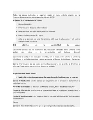 1) La contabilidad de costos es una técnica contable que registra los costos de producción, distribución, administración y financiamiento con el fin de determinar el costo de los productos y servicios de una empresa. 2) Los objetivos de la contabilidad de costos incluyen determinar el costo de los inventarios, calcular el costo de los productos vendidos y proporcionar información sobre costos a la gerencia. 3) Los costos se clasifican en directos e indirectos, fijos y variables, entre otros.