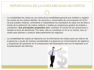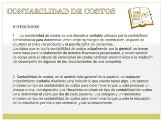 El documento define la contabilidad de costos como una disciplina contable utilizada para determinar el margen de contribución, el punto de equilibrio y el costo del producto. Explica que la contabilidad de costos proporciona datos para la elaboración de estados financieros proyectados y para medir el desempeño de los departamentos de una compañía. Además, destaca la importancia de la contabilidad de costos para la toma de decisiones gerenciales al proporcionar información sobre los costos de la empresa.