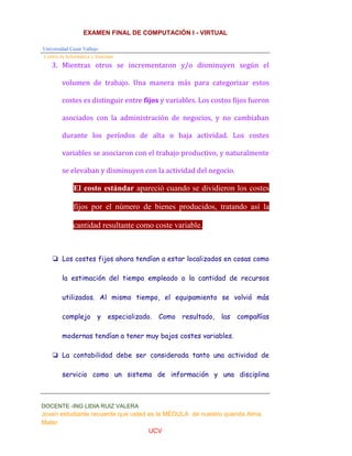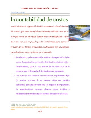 El documento habla sobre la contabilidad de costos y los principios de contabilidad. Explica que la contabilidad de costos es una técnica para registrar costos económicos y definir el valor de costo de bienes producidos o adquiridos. También describe cómo los costos se clasifican como fijos o variables y cómo el costo estándar trata los costos fijos como costos variables. Además, señala que la contabilidad puede considerarse un sistema de información y una disciplina analítica, y que los principios de contabilidad sirven