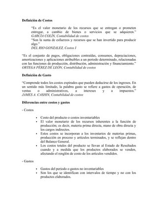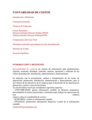 El documento resume los conceptos básicos de la contabilidad de costos, incluyendo la definición, clasificación y componentes de los costos. Explica que la contabilidad de costos es un sistema de información para predeterminar, registrar, acumular, distribuir, controlar, analizar e interpretar los costos de una empresa. También describe los diferentes sistemas de costeo y los componentes del costo total como el costo de producción, distribución, administrativo y financiero.