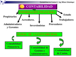 Este documento trata sobre la contabilidad de costos. Explica que la contabilidad de costos es un sistema de información que registra, resume y analiza los detalles de los costos de materiales, mano de obra e indirectos necesarios para producir y vender un producto. También describe los objetivos de la contabilidad de costos, que incluyen proporcionar información sobre los costos de producción, inventarios y operaciones para la toma de decisiones de la gerencia. Además, diferencia entre costos, gastos y pérdidas.
