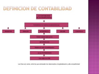 El documento describe la contabilidad como una disciplina técnica que registra, analiza, interpreta y controla la información financiera de una empresa con el objetivo de generar información útil para la toma de decisiones. La contabilidad tiene varios objetivos como establecer un sistema de registro claro, proporcionar el verdadero patrimonio y resultado de la empresa, y suministrar información para la toma de decisiones.