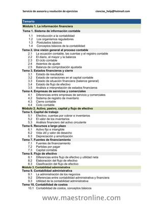 Este documento presenta un servicio de asesoría y resolución de ejercicios de contabilidad y finanzas. Incluye información de contacto y un extenso temario de cuatro módulos que cubren conceptos básicos de contabilidad, activos, pasivos, capital y flujo de efectivo, contabilidad administrativa y presupuestos. Los clientes pueden solicitar cotizaciones y recibir apoyo en la solución de ejercicios contables a través de correo electrónico o en el sitio web listado.
