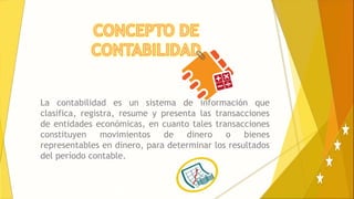 La contabilidad clasifica, registra y presenta transacciones financieras de entidades para determinar sus resultados. Sirve para comprobar transacciones legalmente, establecer la situación financiera mediante activos, pasivos y patrimonio, y proporcionar información para la planificación, evaluación y control. La contabilidad es fundamental para el buen funcionamiento financiero de una empresa al controlar factores que garantizan su estabilidad a través de la contabilidad financiera, administrativa y por actividades.