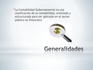 La contabilidad gubernamental es el tipo de contabilidad que registra las operaciones financieras de las entidades y dependencias de la administración pública. Aplica principios como la integración patrimonial y presupuestaria, el método de partida doble y el principio del devengado. Regula aspectos como el reconocimiento de hechos económicos, la depreciación de bienes, la amortización de inversiones y el tratamiento de convenios y créditos.