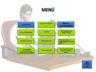 Este documento resume la historia y los tipos de contabilidad. Explica que la contabilidad estudia, mide y analiza la situación financiera de una empresa u organización. Luego describe la macrocontabilidad a nivel nacional y la microcontabilidad a nivel de pequeñas unidades. También resume brevemente el desarrollo de la contabilidad desde la Antigua Roma hasta el Renacimiento y el nacimiento de la contabilidad de partida doble. Finalmente, menciona las escuelas económicas del pensamiento contable en Italia.