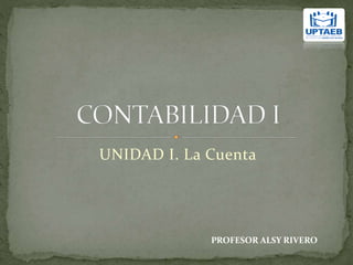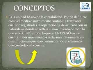El documento explica los conceptos básicos de las cuentas en contabilidad. Indica que las cuentas son la unidad básica para registrar las operaciones de una empresa y que se agrupan en cuentas de activo, pasivo y capital. Describe los tres tipos de cuentas: reales, nominales y de orden. Las cuentas reales muestran los recursos y obligaciones de la empresa. Las cuentas nominales representan los ingresos y gastos. Y las cuentas de orden controlan valores que podrían convertirse en activos u obligaciones.