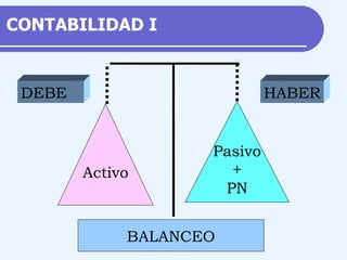 Este documento presenta los conceptos básicos de la contabilidad. Explica que la contabilidad permite identificar, registrar, calcular y almacenar datos sobre las variaciones patrimoniales de una empresa de manera sistemática a través del uso de cuentas. También describe los principales libros contables como el diario, mayor e inventarios y balances, y las reglas para determinar los asientos contables de débito y crédito.