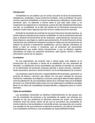 Este documento presenta una introducción a la contabilidad, definiendo conceptos clave como empresa, tipos de sociedades mercantiles, objetivos, metas y tipos de contabilidad. También explica la diferencia entre contabilidad y teneduría de libros, y las relaciones de la contabilidad con otras disciplinas como la economía, estadística y derecho.