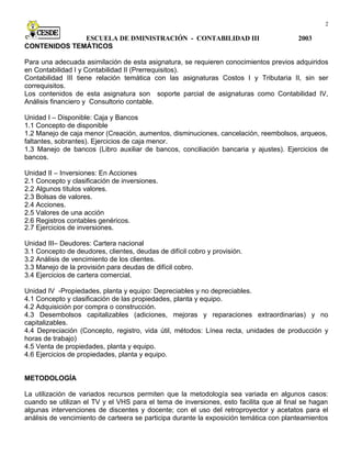 1. Este documento presenta la justificación y contenidos de la asignatura Contabilidad III. El objetivo general es que los estudiantes adquieran conocimientos, habilidades y valores para trabajar con temas relacionados a los activos de las entidades económicas. 2. Los contenidos temáticos incluyen el disponible (caja y bancos), inversiones en acciones, deudores (cartera nacional), y propiedades, planta y equipo. La metodología incluye explicación de temas, aclaración de dudas, desar