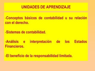 Este documento presenta un resumen de un curso de contabilidad. Incluye conceptos básicos de contabilidad y su relación con el derecho, sistemas de contabilidad, análisis e interpretación de estados financieros y el beneficio de la responsabilidad limitada. También presenta extractos de códigos penales, leyes tributarias y comerciales que regulan la contabilidad y fraudes financieros.