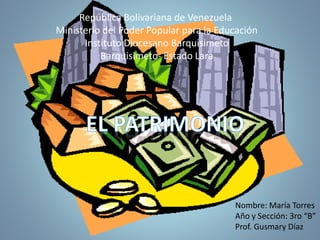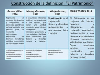 Este documento presenta la definición de patrimonio y sus elementos. Define patrimonio como el conjunto de bienes, derechos y obligaciones de contenido económico pertenecientes a una persona. Explica que los elementos del patrimonio son el activo, pasivo y capital. Luego describe cada uno de estos elementos y diferencia entre la ecuación patrimonial simple y ampliada.