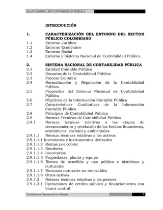 1. El documento presenta el marco conceptual de la contabilidad pública en Colombia. Describe el entorno del sector público colombiano, los objetivos y características de la información contable pública, y los principios y normas técnicas de contabilidad pública.
