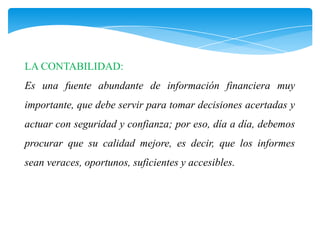 Este documento presenta información sobre conceptos básicos de contabilidad financiera. Explica que la contabilidad es un sistema para medir el desempeño de un negocio y proveer información para la toma de decisiones gerenciales. También describe los principios de contabilidad generalmente aceptados y la importancia de la ética para los contadores públicos.