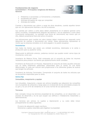 Este documento proporciona una descripción de los principales renglones del balance general de una empresa, incluyendo el fondo fijo de caja chica, bancos, inversiones en valores, cuentas por cobrar, inventarios, activo fijo (inmuebles, maquinaria, equipo, mobiliario, equipo de transporte, equipo de cómputo), depreciación y métodos de depreciación.
