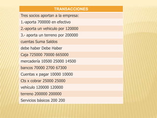 Tres socios aportan capital a una nueva empresa: el primer socio aporta $700,000 en efectivo, el segundo aporta un vehículo valorado en $120,000, y el tercero aporta un terreno valorado en $200,000. El balance general muestra las cuentas resultantes de estas aportaciones iniciales de capital.
