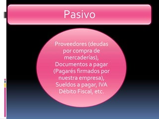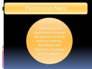 Los activos, pasivos y capital de una empresa forman su patrimonio. Los asientos contables permiten registrar las variaciones económicas mediante un sistema de doble entrada en cada operación. El saldo de una cuenta se genera a partir de los débitos y créditos, pudiendo ser deudor cuando los débitos superan los créditos o acreedor cuando los créditos superan los débitos. El balance general muestra el saldo de cada cuenta al finalizar un período.