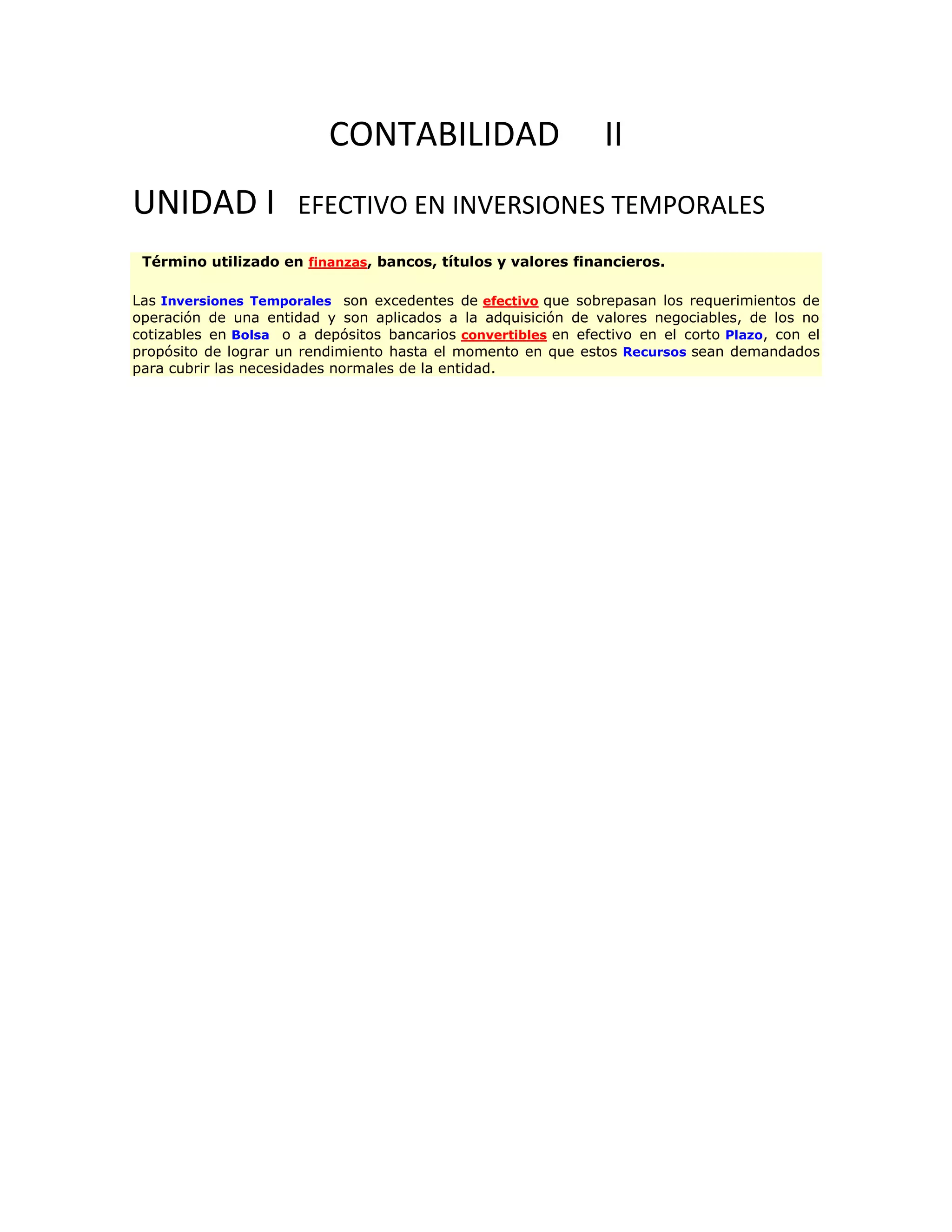 La unidad habla sobre las inversiones temporales de efectivo, que son excedentes de dinero que las entidades usan para adquirir valores negociables u obtener depósitos bancarios de corto plazo con el fin de generar rendimiento hasta que esos recursos sean necesarios para cubrir las necesidades operativas de la entidad. Las inversiones temporales se refieren a fondos que están disponibles por un período corto de tiempo hasta que se requieran para las operaciones normales.