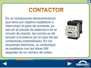 Este documento describe las principales partes de un contactor eléctrico, incluyendo la carcasa, el núcleo, la bobina, la armadura, los contactos y el relé térmico. Un contactor es un dispositivo electromecánico que establece o interrumpe el paso de corriente aplicando o removiendo energía a una bobina. Al energizarse, la bobina crea un campo magnético que atrae la armadura y cierra los contactos, estableciendo así el circuito eléctrico.