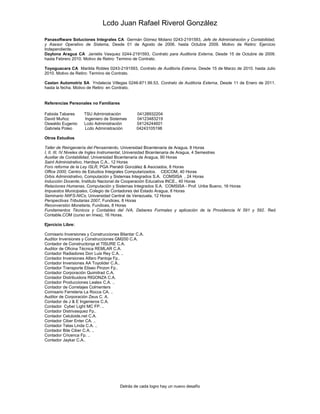 Juan Rafael Riverol González es un contador público con más de 10 años de experiencia en contabilidad, auditoría, administración y liderazgo. Está buscando un nuevo empleo donde pueda aplicar sus habilidades y conocimientos en diferentes áreas como contabilidad general, control de inventario, impuestos, nómina y planificación. Proporciona detalles sobre su educación, experiencia laboral, habilidades técnicas y referencias.