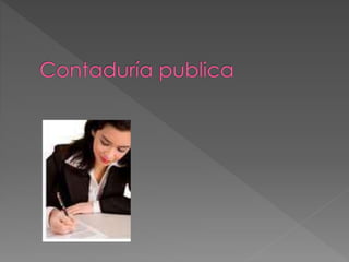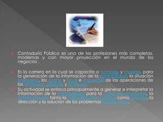 La Contaduría Pública es una carrera que capacita a personas para generar y analizar información financiera y contable que ayuda a las empresas y organizaciones a tomar mejores decisiones. Los contadores públicos se encargan de organizar los sistemas contables, asesorar sobre temas financieros y tributarios, y preparar declaraciones de impuestos. La carrera ofrece muchas oportunidades laborales tanto en empresas privadas como públicas.