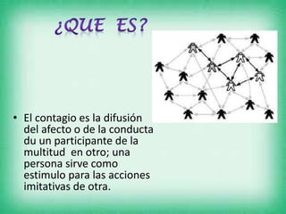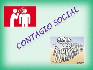 El documento discute las teorías del contagio social y cómo se transmite la conducta entre individuos en grupos. Explica que el contagio implica que las emociones y acciones de otros pueden estimular e influir las propias, llevando a comportamientos similares. También analiza diferentes perspectivas teóricas sobre los mecanismos psicológicos subyacentes al contagio social.