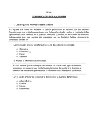 El documento presenta una serie de preguntas sobre conceptos generales de auditoría. Explica que la auditoría financiera es una revisión y evaluación de las operaciones y procedimientos de una empresa con el objetivo de mejorarlos mediante recomendaciones. También define la auditoría administrativa como una revisión sistemática de una entidad para determinar su eficiencia. Finalmente, introduce conceptos como la auditoría fiscal, de sistemas y auditoría interna.