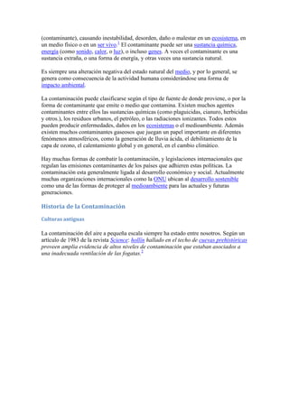 La contaminación se define como la alteración nociva del medio ambiente debido a la introducción de agentes contaminantes, y puede clasificarse por su fuente u tipo de contaminante. Históricamente, la contaminación a pequeña escala siempre ha existido, pero aumentó durante la revolución industrial con el uso masivo de combustibles fósiles en fábricas. En el siglo XIII se prohibió quemar carbón en Londres debido a la contaminación, y en el siglo XIX ocurrió el Gran Hedor en el río Támesis. En la era moderna, ciud