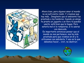 El documento habla sobre la importancia de proteger el medio ambiente. Explica que debemos cuidar el planeta porque su belleza es inmensa y porque dependemos de él para sobrevivir. También menciona que el mundo nos ha sido prestado y no nos pertenece, por lo que debemos utilizar sus recursos con sabiduría en lugar de destruirlos. Finalmente, enfatiza que al cuidar el medio ambiente nos estamos cuidando a nosotros mismos.