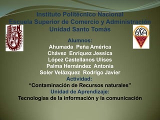 El documento habla sobre la contaminación de recursos naturales. Explica que la contaminación es la presencia de sustancias nocivas en el aire, agua y suelos depositadas por la actividad humana. Luego describe las principales formas de contaminación como sólidas, líquidas y gaseosas, así como el ruido, calor y olores. Finalmente, propone algunas soluciones como reducir la cantidad de residuos, reintegrarlos al ciclo productivo y canalizarlos adecuadamente.