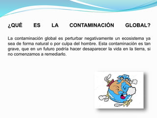 Este documento trata sobre la contaminación global y ambiental. Explica que la contaminación global es perturbar negativamente un ecosistema de forma natural o antropogénica, lo que podría hacer desaparecer la vida en la Tierra. También define el calentamiento global como el aumento de la temperatura media de los océanos y la atmósfera causado por emisiones que intensifican el efecto invernadero. Finalmente, detalla algunas consecuencias como temperaturas más cálidas, tormentas más intensas y alimentos más caros, así como los principales