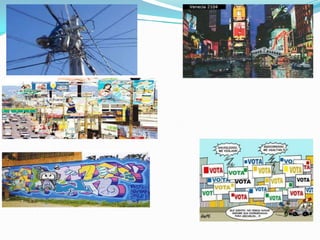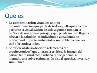 Este documento habla sobre la contaminación visual, definida como aquello que afecta o perturba la visualización de un sitio o rompe la estética de una zona. Explica que los principales elementos que la causan son los carteles, cables, basura y señales, y que la causa principal son los carteles publicitarios. Finalmente, menciona que la contaminación visual puede causar estrés, dolores de cabeza y distracciones peligrosas, y que en 2010 se aprobó un reglamento en España para prevenirla.