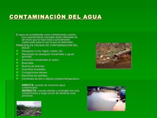 El documento describe los diferentes tipos de contaminación, incluyendo la contaminación del agua, aire, suelo, ruido, visual y térmica. Explica las principales causas de cada tipo de contaminación y cómo afecta negativamente a los seres vivos y al medio ambiente. También presenta algunas soluciones para combatir la contaminación como la limpieza de la atmósfera, el saneamiento de aguas, el reciclaje y el compostaje.