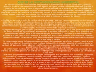 La contaminación ambiental se produce cuando sustancias dañinas alteran el medio ambiente de forma perjudicial para la salud humana y otros seres vivos. El progreso tecnológico y el crecimiento demográfico han deteriorado el medio ambiente a través de la contaminación del agua, suelo y aire por desechos industriales, vehículos y actividades agrícolas e individuales. Para mitigar este problema es necesario regular dichas actividades y crear conciencia sobre el cuidado del medio ambiente.
