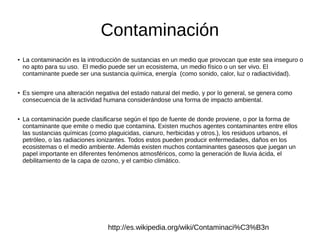 La contaminación se define como la introducción de sustancias en un medio que lo hacen inseguro o no apto para su uso. Puede clasificarse según la fuente o tipo de contaminante, e incluye sustancias químicas, residuos, petróleo y radiaciones. Los contaminantes pueden causar enfermedades y daños a los ecosistemas y medio ambiente, como lluvia ácida, debilitamiento de la capa de ozono y cambio climático.
