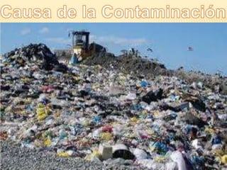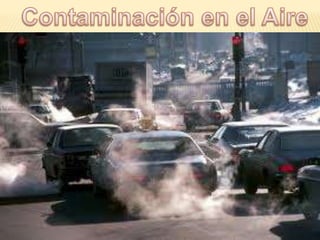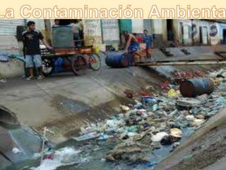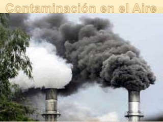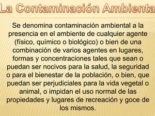 Este documento describe tres tipos principales de contaminación ambiental: contaminación del aire, agua y suelo. La contaminación del aire se refiere a la presencia de sustancias introducidas por actividades humanas que pueden ser perjudiciales para la salud o el medio ambiente. La contaminación del agua implica la incorporación de materias extrañas como productos químicos o residuos que deterioran su calidad. La contaminación del suelo se debe principalmente a la acumulación de residuos industriales y agrícolas así como al uso de plaguicidas