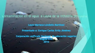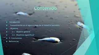 El documento analiza los efectos negativos de la contaminación por petróleo en las aguas oceánicas. Esto provoca una película impermeable que afecta rápidamente a la fauna marina y ecosistemas. A largo plazo, el petróleo derramado puede depositarse en sedimentos y contaminar repetidamente el agua y la cadena alimenticia. El documento busca calcular el impacto de los derrames de petróleo y concientizar a la industria sobre los daños ambientales.