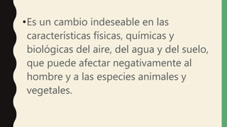 La contaminación se define como un cambio indeseable en el medio ambiente que puede afectar negativamente a los seres humanos, animales y plantas. Se clasifica los residuos en biodegradables, que pueden descomponerse naturalmente, y no biodegradables, como metales y plásticos, que no se descomponen fácilmente. La contaminación afecta a los ecosistemas de forma interconectada, por ejemplo, los desechos domésticos contaminan el agua y afectan a la vida marina, mientras que la destrucción de la cap