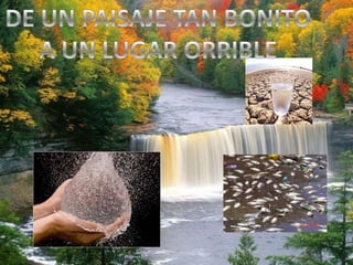 El documento resume cuatro tipos principales de contaminación: contaminación auditiva, contaminación visual, contaminación del aire y contaminación del agua. La contaminación auditiva se refiere al exceso de sonido que altera el medio ambiente. La contaminación visual incluye cualquier cosa que afecte la estética de un área o paisaje. La contaminación del aire se refiere a la introducción de contaminantes en la atmósfera. Y la contaminación del agua puede transmitir enfermedades al ser esencial para la vida pero también vulnerable a la contaminación.