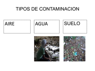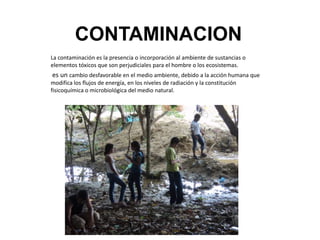 La contaminación es la presencia de sustancias o elementos tóxicos en el ambiente que son perjudiciales para las personas y los ecosistemas. Es un cambio desfavorable causado por la acción humana que afecta los niveles de energía, radiación y la composición física, química o microbiológica del medio ambiente natural. El documento también lista los tipos de contaminación del aire, agua y suelo.