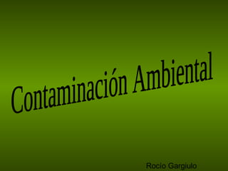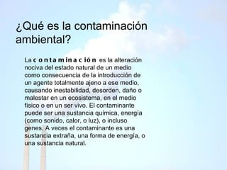 El documento describe los diferentes tipos de contaminación ambiental como la contaminación del agua, suelo y aire. Explica que la contaminación se debe principalmente al crecimiento de la población, la industrialización y la urbanización. Estos procesos introducen sustancias extrañas y desechos que dañan los ecosistemas y la salud humana. Para combatir la contaminación, se deben desarrollar prácticas sostenibles de agricultura, proteger los hábitats naturales y limitar el uso de recursos y contaminantes.