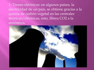 El documento describe dos tipos de trenes y su impacto ambiental. Los trenes eléctricos pueden contribuir a la contaminación a través de la quema de carbón en centrales eléctricas. Los trenes a leña queman leña o carbón directamente, liberando dióxido de carbono, aunque esto podría mitigarse plantando árboles para reemplazar los talados. En general, el documento analiza cómo diferentes tipos de trenes pueden afectar el medio ambiente a través de las emisiones de dióxido de carbono.