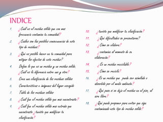 Este documento presenta una investigación sobre los residuos sólidos que más contaminan una comunidad. Identifican que el papel y el plástico son los residuos más comunes. Las posibles consecuencias incluyen crisis ambientales y cambio climático. Para mitigarlos, proponen proyectos comunitarios de reutilización y educación. Clasifican los residuos y encuentran más plástico y papel. Sugieren campañas de concientización y reciclaje para prevenir más contaminación.