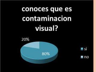 Este documento habla sobre la contaminación visual en la ciudad de Mexicali, Baja California, México. Explica que la contaminación visual incluye carteles, cables, postes y otros elementos que invaden el espacio público y afectan negativamente a la sociedad. El boulevard Lázaro Cárdenas se usa como ejemplo de este problema. El documento también analiza cómo la contaminación visual puede causar estrés, dolores de cabeza y distracciones peligrosas.