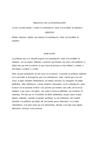Este documento presenta los hallazgos de una investigación sobre la contaminación visual en la localidad de Chapinero en Bogotá, Colombia. El objetivo fue diseñar soluciones para reducir la contaminación visual mediante entrevistas y observación. Los resultados mostraron que hay más de 4,000 elementos de contaminación visual en Chapinero que afectan la salud de los habitantes y el paisaje. Las conclusiones fueron que se necesitan leyes más estrictas y su cumplimiento para reducir la contaminación visual y sus impactos negativos.