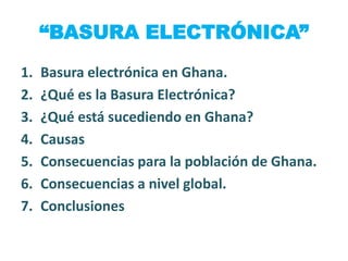 El documento aborda la problemática de la basura electrónica en Ghana, destacando su impacto social, ambiental y de salud, especialmente en el barrio de Agbogbloshie, donde residuos electrónicos de países desarrollados afectan gravemente a la población. Se describen las causas detrás del tráfico de residuos, como la obsolescencia programada y el incumplimiento de tratados internacionales, así como las consecuencias de la explotación infantil y la contaminación. Finalmente, se hace un llamado a la acción para promover un compromiso global hacia un desarrollo sostenible y la educación ambiental.
