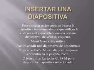 Este documento explica cómo insertar, eliminar, copiar y mover diapositivas en una presentación de PowerPoint. Se describen las diferentes formas de realizar estas acciones, ya sea utilizando los botones en la cinta, los menús contextuales, las combinaciones de teclas o arrastrando las diapositivas.