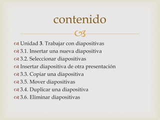 Este documento describe los pasos para trabajar con diapositivas en PowerPoint. Explica cómo insertar nuevas diapositivas, seleccionar diapositivas existentes, copiar, duplicar y mover diapositivas entre presentaciones, y eliminar diapositivas no deseadas.